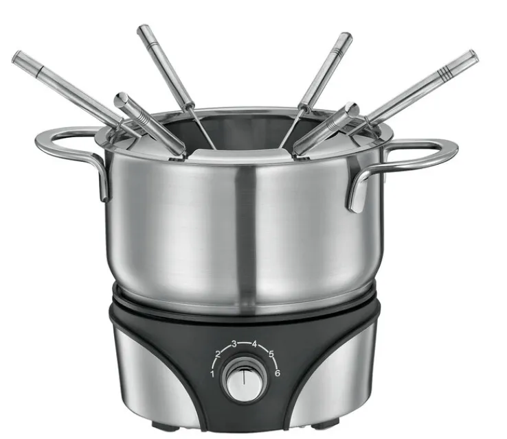 Das Fondue besteht aus hochwertigem Edelstahl, das mit einer silberfarbigen Oberfläche, einer hohen Rostbeständigkeit und pflegeleichten Eigenschaften überzeugen kann. Einige Komponenten bestehen außerdem aus schwarzem Kunststoff. Der Fondue-Topf hat ein Fassungsvermögen von 1,5 Liter und ist mit einem Spritzschutz, einem Rechaud und sechs Fonduegabeln mit Markierungen ausgestattet. Er besitzt eine Leistung von 1200 Watt und bietet einen Temperaturbereich von 50 bis 210 °C, der sich per Drehregler einstellen lässt.