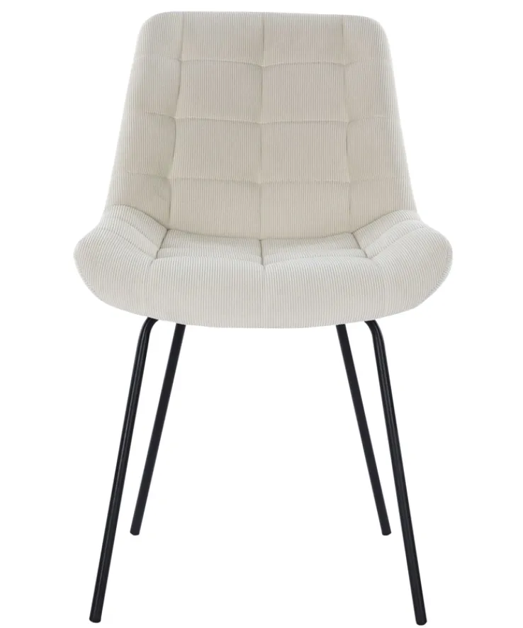 Ein Stuhl im modernen Stil mit einem cremefarbig-beigen Cord-Bezug plus einem stabilen Vierfußgestell aus schwarz pulverbeschichtetem Metall – das ist der Stuhl OLIVIA von PHILL HILL. Die Sitzhöhe des Stuhls beträgt 49,0 cm, die Breite 50,0 cm, die Gesamthöhe 79,0 cm und die Tiefe 61,0 cm.