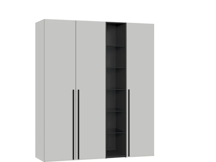 Der Schrank verfügt über drei Drehtüren, die einen einfachen Zugang zu den zwei integrierten Kleiderstangen und den sieben Einlegeböden ermöglichen. Diese bieten ausreichend Platz für Kleidung und andere persönliche Gegenstände. Zusätzlich sind sechs offene Fächer vorhanden, die sich ideal zur Präsentation von Dekorationsobjekten eignen. Die langen, schwarzen Griffe unterstreichen das moderne Design und sorgen für eine komfortable Handhabung. Dieses Möbelstück vereint Funktionalität und Ästhetik und ist eine Bereicherung für jedes Zuhause.