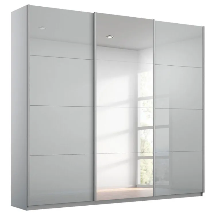 Gefertigt aus einer hochwertigen Holznachbildung, Metall, Farb- und Spiegelglas ist der Kleiderschrank KULMBACH besonders robust und standhaft. Insgesamt stehen drei Schwebetüren zur Verfügung. Die zwei außenliegenden Türen setzen sich mit einem Grauglaseinsatz optisch gekonnt von dem seidengrauen Korpus ab. Mittig befindet sich eine großflächige Spiegeltür. Im Innenbereich des Möbels stehen drei praktische Kleiderstangen und drei Fachböden zur Verfügung, sodass Textilien individuell angeordnet und sortiert werden können. Mit schlanken Maßen von 203 x 210 x 62 cm eignet sich der Kleiderschrank KULMBACH von QUARTIER für unterschiedlich große Räume wie das Schlaf-, Jugend- oder Gästezimmer.