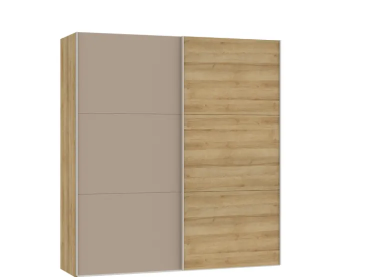 Der Schwebetürenschrank aus der Serie SLIDELINE vereint modernes Design mit praktischer Funktionalität. Mit einer Breite von 202,5 cm, einer Höhe von 220 cm und einer Tiefe von 65 cm bietet er großzügigen Stauraum. Der Schrank ist in einem natürlichen Eichendekor gehalten, das durch die Kombination mit mattem Nougatglas eine elegante Optik erhält. Die zwei Schwebetüren ermöglichen einen einfachen Zugang und tragen zur platzsparenden Nutzung bei. Der Schrank besteht aus einer hochwertigen Holznachbildung und Glas, was ihm eine robuste und langlebige Struktur verleiht. Im Inneren befinden sich zwei Einlegeböden, die eine flexible Organisation des Stauraums ermöglichen. Die moderne Gestaltung und die warmen Brauntöne machen diesen Schrank zu einem stilvollen Element in jedem Schlafzimmer. Die klare Linienführung und die dezente Farbgebung passen sich mühelos verschiedenen Einrichtungsstilen an.
