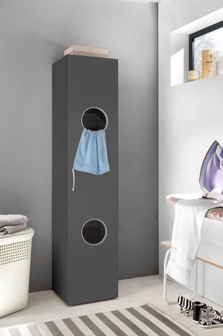 Der Wäscheschrank aus der Serie Multiraumkonzept überzeugt durch sein modernes Design und seine funktionale Gestaltung. Mit einer Breite von 40 cm, einer Höhe von 185 cm und einer Tiefe von 40 cm bietet er ausreichend Stauraum für Ihre Wäsche. Die graphitgraue Farbe verleiht dem Schrank eine elegante Optik, die sich nahtlos in verschiedene Einrichtungsstile einfügt. Die matte Oberfläche aus Holznachbildung sorgt für eine pflegeleichte Handhabung und eine ansprechende Haptik.