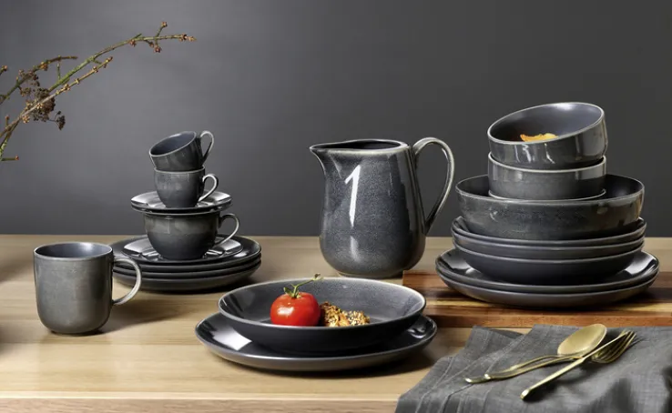 Zu diesem praktischen Frühstücksservice im trendigen Industrial Skandi-Stil gehören vier Kaffeebecher, vier Müslischalen und vier Frühstücksteller. Das Set überzeugt durch ein minimalistisches und zweckbetontes Design sowie eine markante, rustikale Ästhetik. Ein schöner Blickfang ist die Kombination aus zwei verschiedenen Oberflächenbeschichtungen: Während die Innen- und Unterseiten der grauen Geschirrteile mit einem soften Matt-Finish veredelt sind, sind die Außen- und Oberseiten mit einer Reaktivglasur versehen. Die elegante graphitgraue Farbgebung verleiht dem Frühstückstisch eine moderne Note.