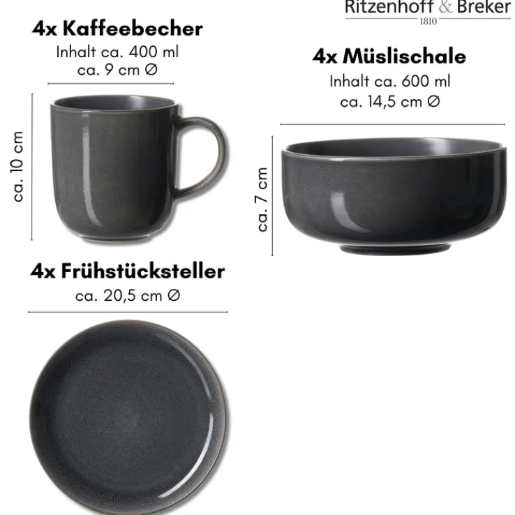 Das 12-teilige Frühstücksservice TOLEDO von Ritzenhoff & Breker ist aus hochwertigem Steinzeug in der Farbe Grau gefertigt. Es ist spülmaschinenfest und mikrowellengeeignet.