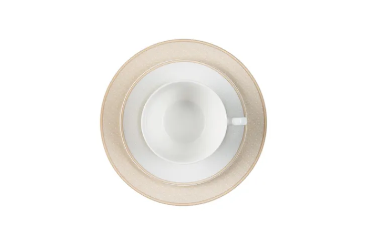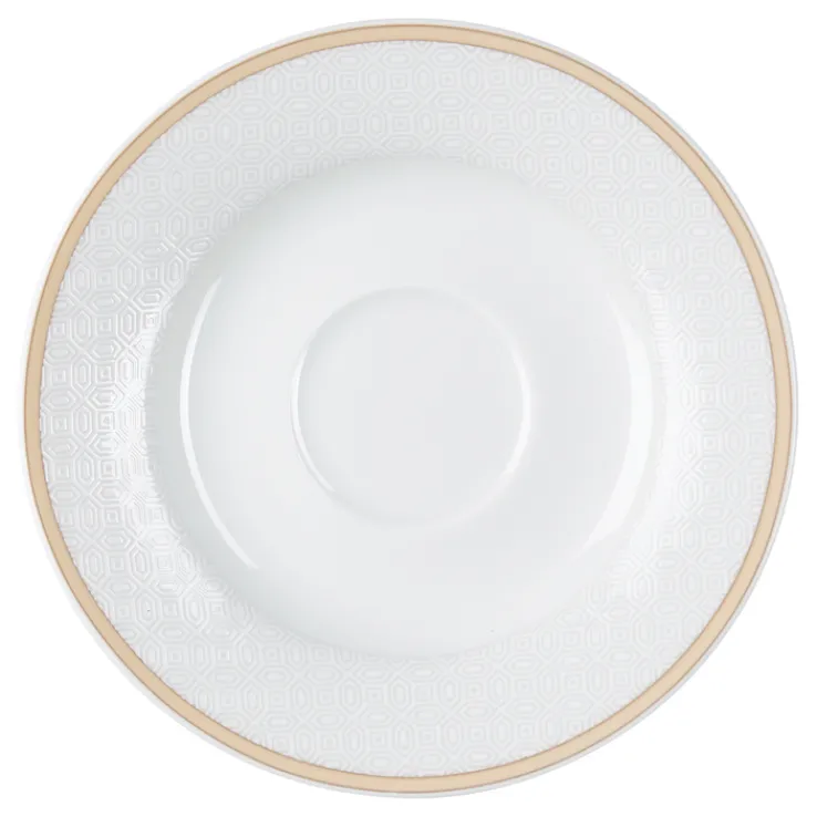 Die Ritzenhoff & Breker Kaffee-Untertasse GEO aus Porzellan mit beigem Rand sorgt dafür, dass die Kaffee-Tasse der Serie keine Ränder auf dem Esstisch hinterlässt. Sie ist mit ihrem eleganten Design mit zierlichem geometrischem Muster zudem eine Augenweide.