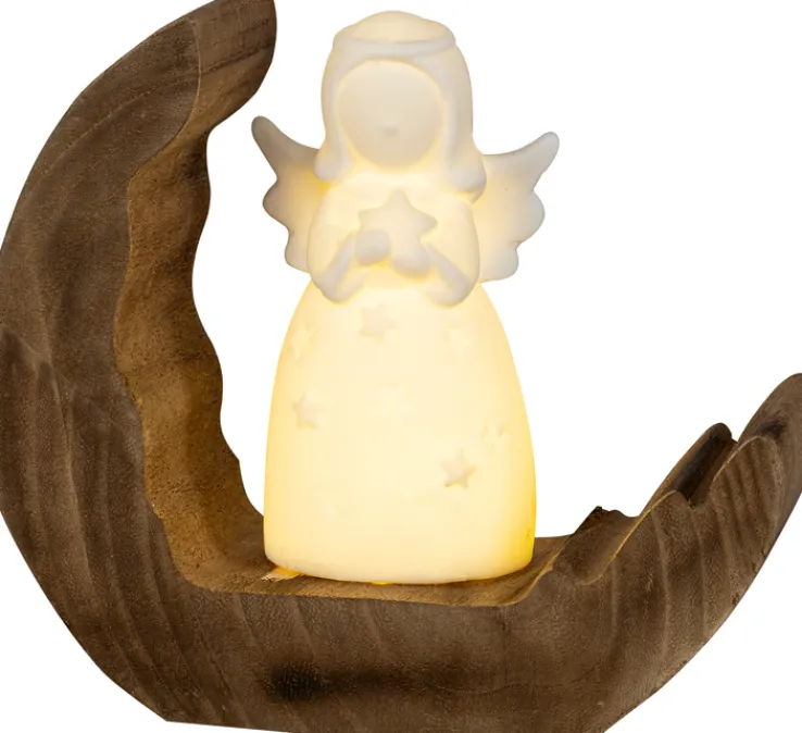 Dieses Lichtobjekt aus der Serie ENGEL kombiniert Holz und Keramik zu einem dekorativen Element für den Innenbereich. Die Figur eines Engels steht auf einem mondförmigen Sockel aus dunklem Holz. Der Engel ist aus heller Keramik gefertigt und mit ausgestanzten Sternmotiven versehen, durch die ein sanftes Licht scheint. Die Figur hält einen kleinen Stern in den Händen und zeichnet sich durch eine schlichte, freundliche Formsprache aus.