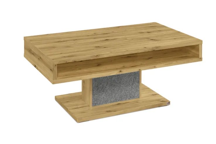 Der 110 x 65 cm große Couchtisch DELTONA aus dem Hause set one by Musterring kombiniert Eiche-Artisan-Dekor mit einem gut sichtbar abgesetzten Sandstein-Element. Die Kombination verschiedener Materialien lässt den Couchtisch, der sich vor Sofas ebenso wie vor Wohnlandschaften wohlfühlt, zu einem spannenden ebenso wie abwechslungsreichen Blickfang avancieren.