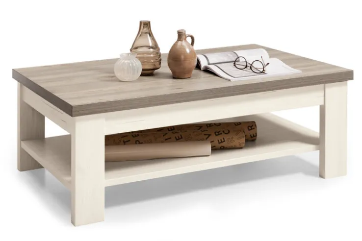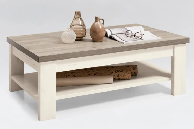 Die Kombination aus brauner Tischfläche und weißem Gestell bringt eine freundliche Note in den Raum. Der Tisch misst in Länge und Breite 110 x 70 cm. Durch die zusätzliche Ablage bietet er einigen Stauraum, beispielsweise für Zeitungen und Zeitschriften. Besonders attraktiv wirkt das Möbel, wenn es vor einer hellen Couch in Weiß, Sand oder Beige aufgestellt wird. Auch ein Braunton, der zur Tischplatte passt, sieht harmonisch aus.