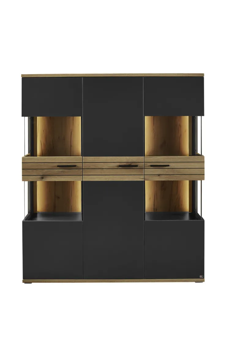 Zur Ausstattung der Set one by Musterring Vitrine QUINCY gehören drei Drehtüren, vier Einlegeböden sowie sechs feste Holzböden. Die Hauptfarbe Anthrazit wird von Designelementen aus Coast Evoke Eiche Nachbildung unterbrochen. Eine besondere optische Leichtigkeit entsteht, wenn die Fächer hinter den Glastüren beleuchtet werden. Damit wird auch die Rückwand aus Eichenholz sichtbar. Mit den Griffstangen können alle Türen leicht bedient werden. Die Tiefenausladung von 40 cm bietet im Wohnzimmer oder anderen Räumen viel Stauraum.