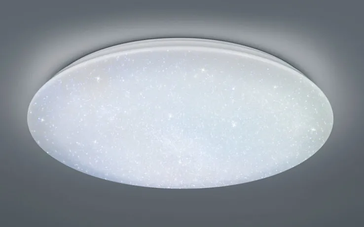 Die fest eingebaute LED ist auf 25.000 Stunden Brenndauer ausgelegt. Sie erreicht 3.000 bis 5.500 K (Kelvin), das entspricht warmweißem beziehungsweise tageslichtweißem Licht. Mit der Fernbedienung stellen Sie die Lampe nach Ihren Wünschen ein. Ihre Helligkeit beträgt 6.400 lm (Lumen). Die Deckenlampe NAGANO ist schlicht gearbeitet und passt in jeden Raum (außer Feuchträume). Besonders schön wirkt sie im Schlafzimmer oder Kinderzimmer, denn ihr Sterneffekt passt hierher am besten.
