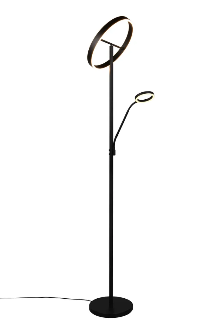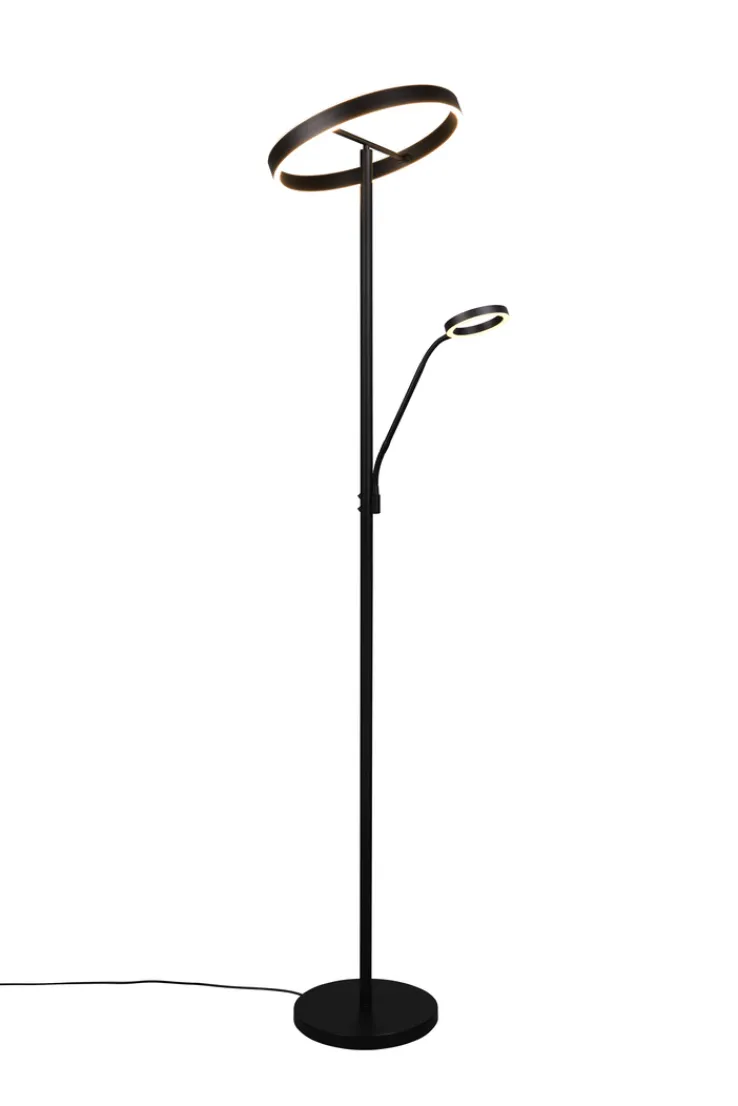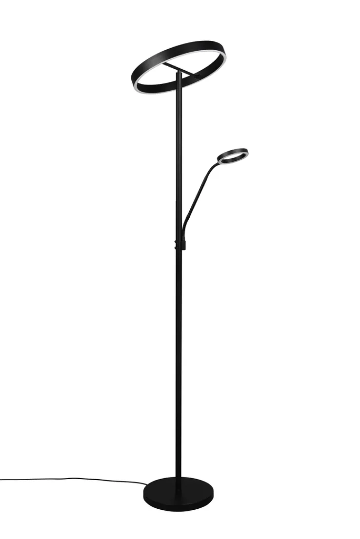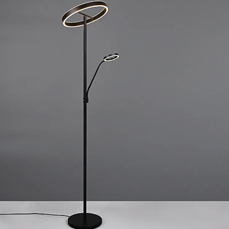 Der Deckenfluter mit Leselampe aus der Serie WILLIS von TRIO vereint modernes Design mit funktionaler Beleuchtung. Die Lampe ist aus hochwertigem Metall gefertigt und präsentiert sich in einem eleganten Schwarz mit matter Optik. Mit einer Höhe von 180 cm und einem Durchmesser von 40 cm fügt sie sich harmonisch in verschiedene Wohnräume ein. Der runde Tellerfuß sorgt für Stabilität und unterstreicht das zeitgemäße Design. Die integrierte LED-Beleuchtung bietet eine Lichtleistung von 4.600 Lumen bei einer Farbtemperatur von 2700/3200/4.000 Kelvin. Zusätzlich ist die Lampe mit einem Sensordimmer ausgestattet, der eine dreistufige Dimmung und eine Lichtfarbverstellung (CCT) ermöglicht. Die Leselampe ist separat schaltbar und bietet eine zusätzliche Lichtquelle mit 550 Lumen. Diese Lampe ist ideal für alle, die eine stilvolle und anpassungsfähige Beleuchtungslösung suchen.