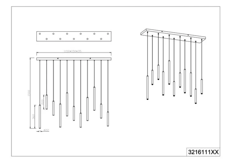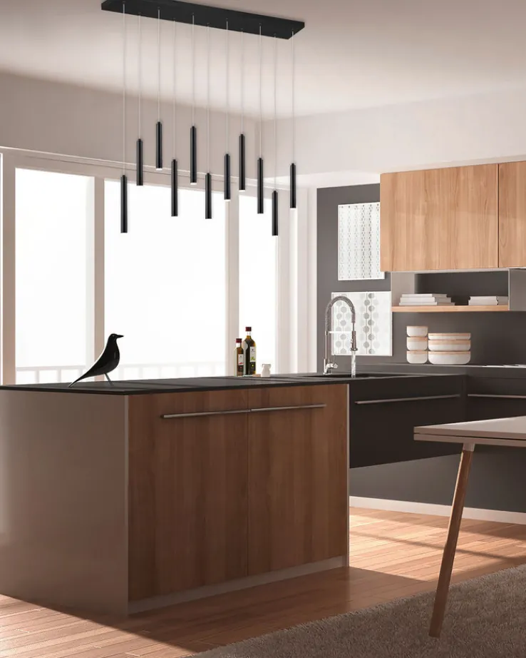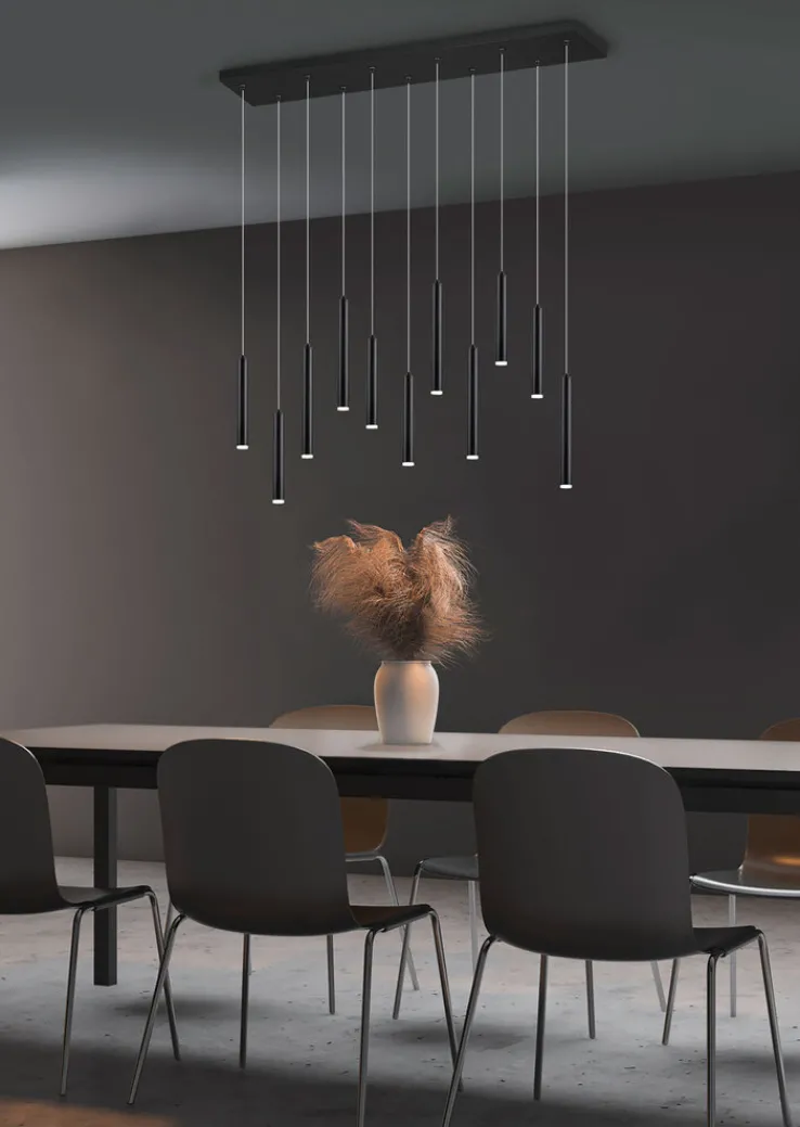 Die CE-geprüfte TRIO LED Pendellampe TUBULAR kombiniert elf Brennstellen aus schwarzem Metall und erinnert optisch an ein Klangspiel. An den Enden jeder Röhre befindet sich eine fest integrierte LED-Lampe. Gemeinsam erreichen die LED-Leuchten eine Helligkeit von maximal 2420 Lumen, die Helligkeit lässt sich jedoch über einen geeigneten Wanddimmer dreistufig verstellen. Die Pendellampe bietet zudem eine warmweiße Farbtemperatur von 3000 Kelvin, die dem Wohnraum auch bei maximaler Helligkeit eine gemütliche Atmosphäre verleihen.