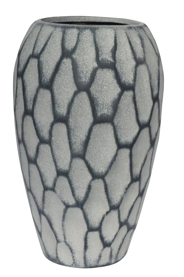 Die dekorative Vase hat eine Höhe von etwa 30 cm und ist zeitlos elegant. Durch das tolle Wabenmuster auf der Oberfläche im Farbton schiefergrau hat die bauchige Vase einen besonderen Charme und passt in modern oder klassisch eingerichtete Wohnbereiche. Sie ist als Solitär oder auch mit weiteren Dekorationen ein Blickfang. Auf dem Wohn- oder Esszimmertisch platziert setzt die Vase mit Schnittblumen oder Trockenblumen einen geschmackvollen Akzent.