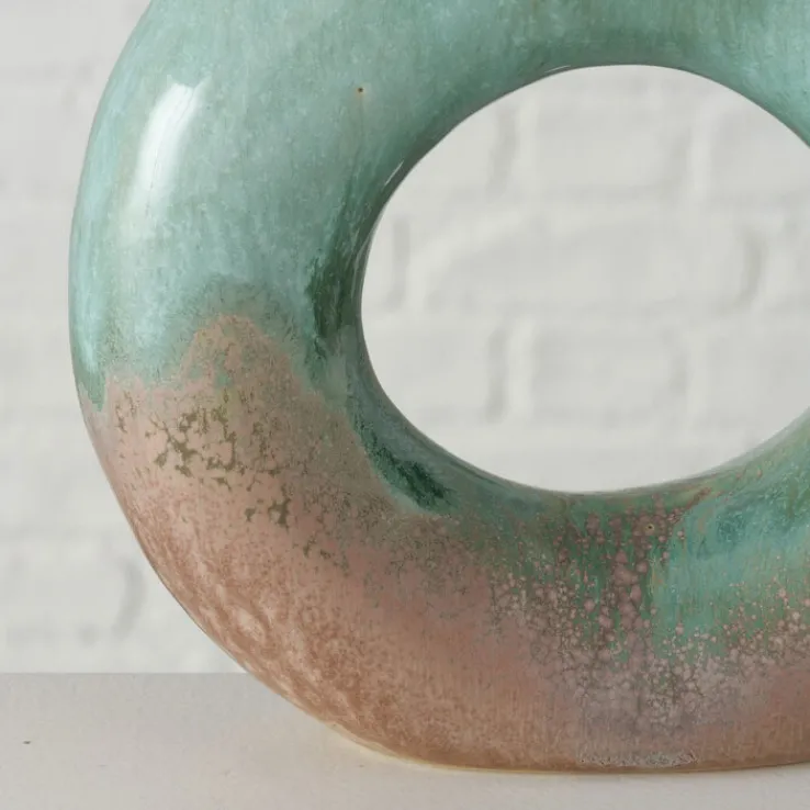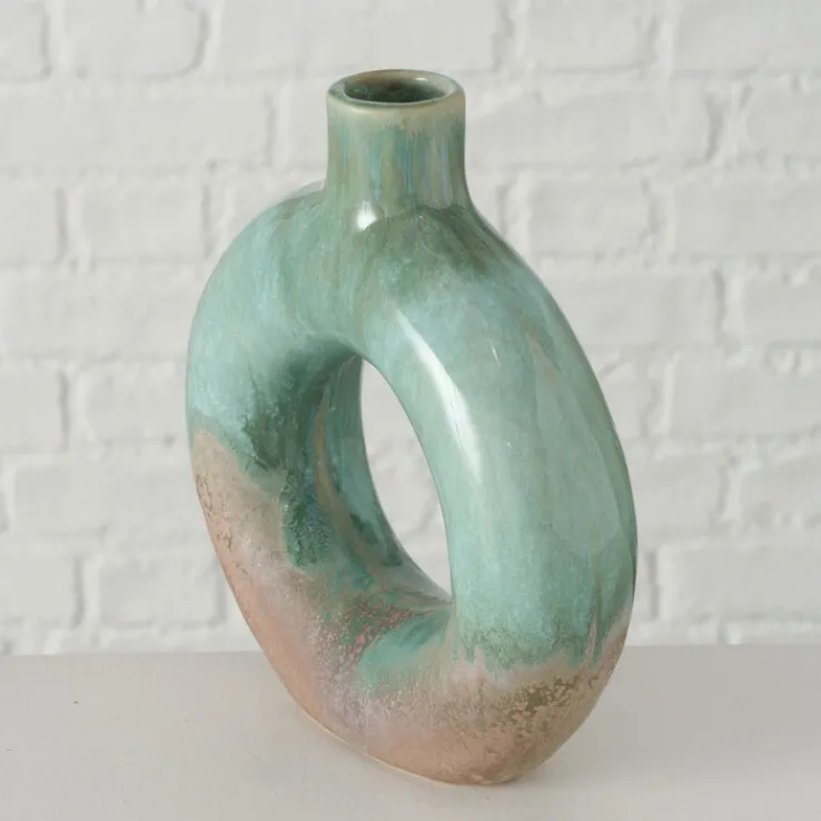 Ihre außergewöhnliche Kreisform mit der großen runden Aussparung in der Mitte macht die Vase Peruya zu einem tollen Hingucker. Die wie zufällig ineinander verlaufenden Farben und der handwerkliche Charakter geben ihr eine natürliche und gleichzeitig wertvolle Anmutung. Erinnerungen an einen Jadestein oder ein edel gealtertes Kupferobjekt kommen bei der Betrachtung auf. Aufgrund der besonderen Farbgestaltung passt diese Keramikvase in jede Jahreszeit. Als Blumenvase mit frischen Blumen oder getrockneten Gräsern wirkt sie ebenso dekorativ wie als ungefülltes Designobjekt.