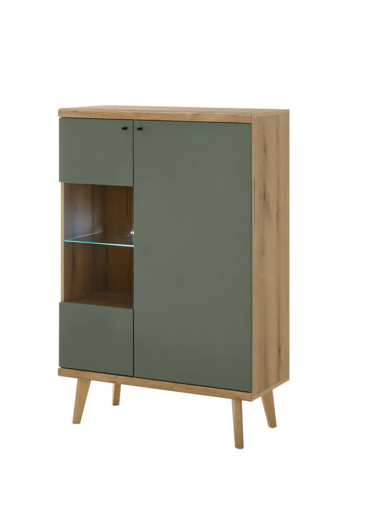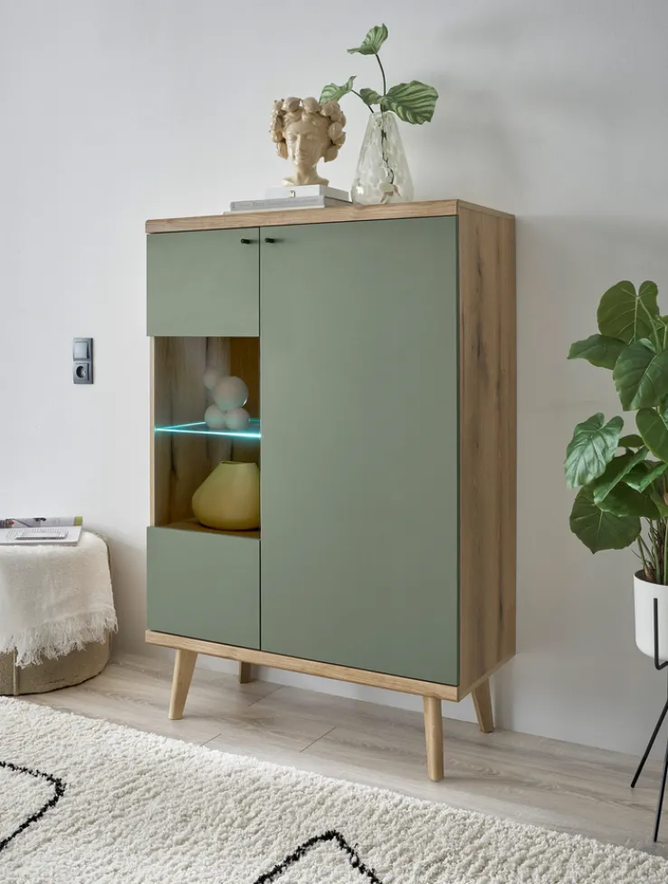 Die zweifarbige Vitrine ALVA hat eine Größe von 90 x 134 cm. Das salbeifarbige und braune Möbelstück besticht auch durch das Korpus mit Eiche Evoke-Dekor.