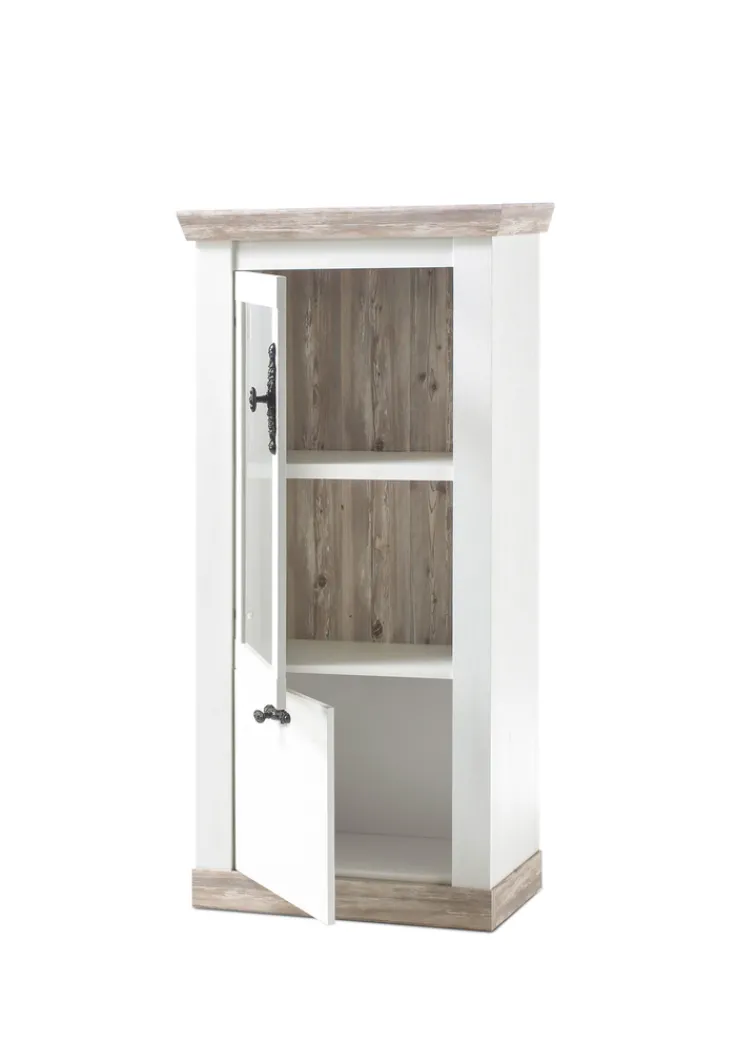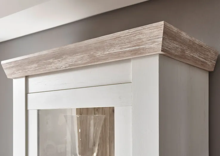 Korpus und Fronten der Vitrine FLORENZ bestehen aus weiß beschichteter Holznachbildung. In die Glas-Drehtür oben sind Applikationen im Pinie-Oslo-Dekor in einem matten, braunen Farbton eingearbeitet. In den großzügig bemessenen drei Innenfächern finden auch größere und schwere Gegenstände Platz. Denn der flache Boden mit Sockelleiste verleiht dem Modell eine hohe Tragfähigkeit. Ein weiteres Highlight sind die Knopfgriffe. Sie sind in eine verspielt designte, ebenfalls schwarze Metallplatte eingefasst.