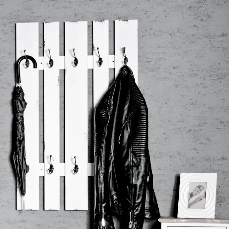 Die Wandgarderobe ist mit zehn schwarzen Haken aus robustem Metall ausgestattet. Daran können Sie Jacken, Mäntel, Schals und andere Dinge aufhängen. Die Haken sind an einer Basis aus einer palettenartigen Konstruktion aus MDF befestigt. Diese ist in Weiß gestrichen und begeistert mit einem coolen Used-Look. Da Sie die Garderobe an der Wand befestigen können, verbraucht sie keine Bodenfläche, sodass sie auch für kleine Flure perfekt geeignet ist. Außerdem erschlägt sie den Raum aufgrund ihrer hellen Farbe nicht, sondern trägt zu einer freundlichen Atmosphäre bei.