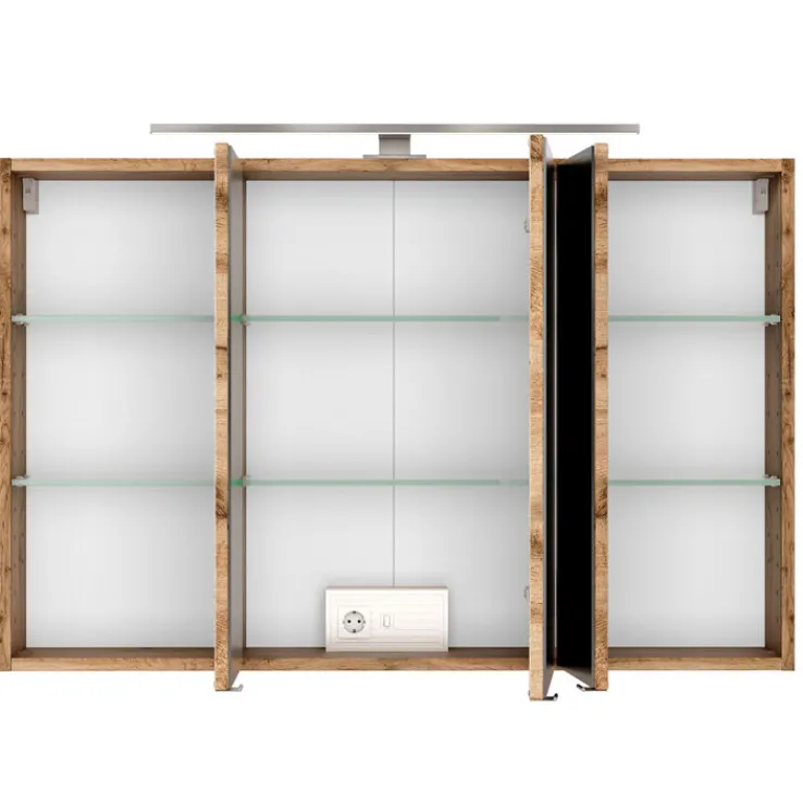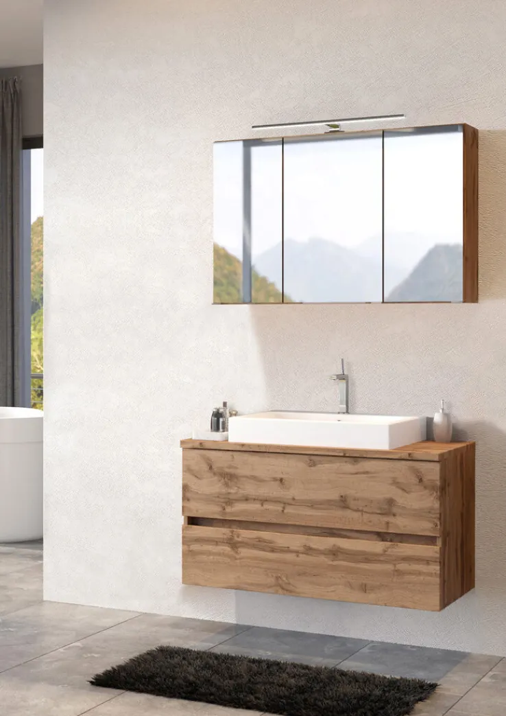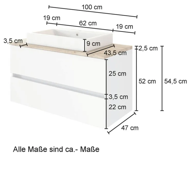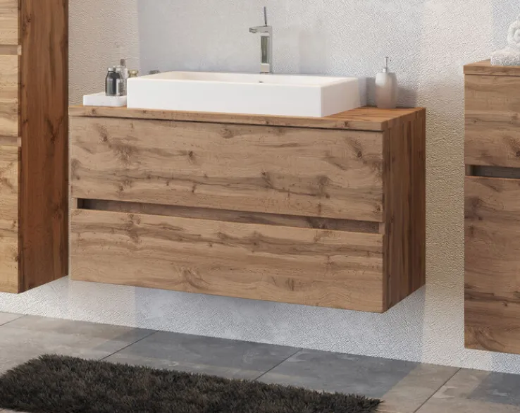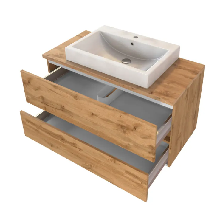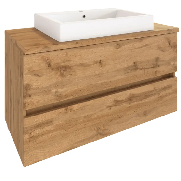 Der Waschtisch BREGENZ kommt inklusive einem rechteckigen Aufsatzbecken 43,5 × 62 cm. Dieses ist aus Keramik gefertigt und hat eine Randhöhe von 9 cm. Der Korpus ist aus Spanplatte gefertigt. Die Holznachbildung (Wotaneiche) ist auf eine Folierung zurückzuführen. Die beiden Schubkästen kommen ohne klassischen Griffe aus. Über Vollauszüge aus Metall fahren sie ein und aus. Das erfolgt leise per Soft-Close. Hier lassen sich Handtücher, Kosmetik und schwerere Badutensilien unterbringen.