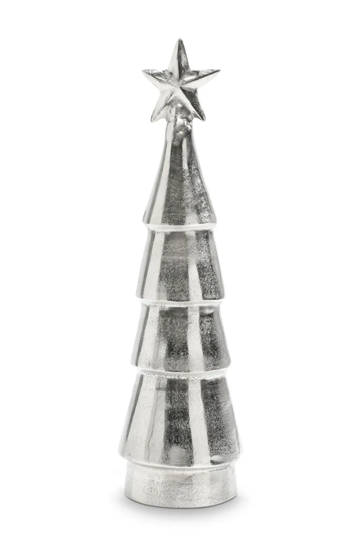 Dieses Deko-Objekt aus der Serie BLACK FOREST besticht durch seine moderne, stilisierte Tannenbaumform mit einem klaren, konischen Aufbau. Der Baum ist aus silberfarbenem Aluminium gefertigt und besitzt eine strukturierte Oberfläche, die für einen dezenten Glanz sorgt. Die Oberfläche zeigt eine leichte Maserung und eine handwerklich anmutende Fertigung, was dem Objekt einen charakteristischen Ausdruck verleiht.