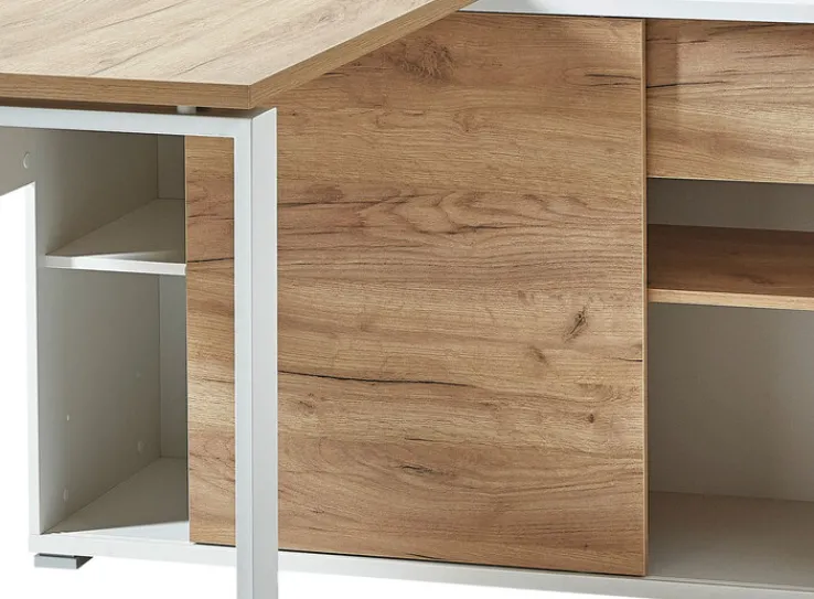 Der funktionelle Winkelschreibtisch LION mit den Maßen 117 x 120 cm ist die praktische Ecklösung für kleinere Jugend- oder Arbeitszimmer. Durch seine Oberflächen in der Farbe weiß und Navarra-Eiche ist der funktionell gestaltete Arbeitsplatz sehr gut in bereits bestehende Einrichtungen integrierbar. Die große Schreibtischplatte und die Oberplatte des Sideboards bieten viel Platz für verschiedene Arbeitsmaterialien. Zusätzlicher Stauraum steht in einem offenen Fach mit Einlegeboden, einem Schubkasten und einem Schrank mit Schiebetür zur Verfügung.