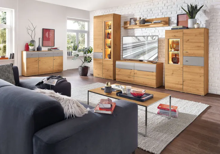 Das Set besteht aus sechs Teilen, darunter ein Wandboard, zwei Highboards, ein Lowboard und zwei Schränke. Die Highboards und Schränke bieten ausreichend Stauraum mit insgesamt acht Drehtüren. Die klaren Linien und die matte Optik der Fronten harmonieren perfekt mit der natürlichen Holzstruktur. Die Glasvitrinen sind ideal, um dekorative Elemente stilvoll zu präsentieren. Diese Wohnwand ist nicht nur ein Blickfang, sondern auch eine praktische Lösung für die Organisation Ihres Wohnraums.